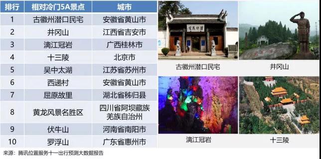 不過(guò),不管是南方還是北方,不管是歷史古跡還是古城古鎮(zhèn)、山岳湖泊,到了國(guó)慶黃金周,景區(qū)必然是人擠人、人挨人,讓很多游客抱怨“風(fēng)景沒(méi)看多少,只看到數(shù)不清的人頭和屁股”,想找風(fēng)景優(yōu)美但游客不那么多的景點(diǎn)嗎?騰訊位置服務(wù)發(fā)布的國(guó)慶旅游大數(shù)據(jù)報(bào)告顯示,在國(guó)家旅游局確定的249個(gè)國(guó)家5A級(jí)旅游風(fēng)景區(qū)中,古徽州潛口民宅、井岡山、漓江冠巖、北京十三陵、蘇州吳中太湖、黃山西遞村屈原故里、四川黃龍風(fēng)景名勝區(qū)、南陽(yáng)伏牛山、惠州羅浮山是相對(duì)冷門(mén)的十大5A風(fēng)景區(qū)。十一出游不想看“人”,不妨試試這些相對(duì)冷門(mén)的景點(diǎn)吧!