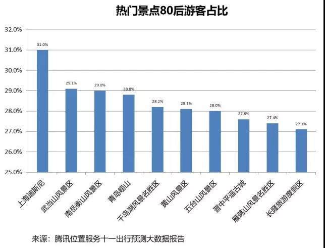 90后出游占比超三分之一,80后最愛(ài)上海迪斯尼據(jù)國(guó)家旅游局統(tǒng)計(jì),2017年黃金周期間國(guó)內(nèi)旅游人數(shù)達(dá) 6.63 億人次。騰訊位置服務(wù)則預(yù)測(cè),今年旅游人數(shù)將進(jìn)一步提升,其中男游客和女游客的比例約為58%:42%,大多數(shù)景點(diǎn)男游客都比女游客要多,但也有少數(shù)景點(diǎn)更受女游客青睞,最明顯的例子就是黃山,其三大景點(diǎn)皖南古村落(西遞)、古徽州潛口民宅和徽州古城,女游客的數(shù)量均多于男游客,承德避暑山莊、蘇州拙政園、北京恭王府等對(duì)女性的吸引力同樣高于其他景點(diǎn)。