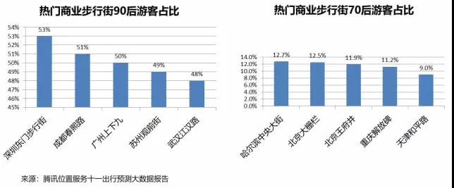 在逛街購(gòu)物方面,90后和80后依然占據(jù)了超過(guò)三分之二。從不同年齡段的偏好來(lái)看,深圳東門(mén)步行街、成都春熙路、廣州上下九、蘇州觀前街和武漢江漢路是90后最愛(ài)逛的步行街,無(wú)一在北方;70后最愛(ài)逛的分別是哈爾濱中央大街、北京大柵欄、北京王府井、天津和平路和重慶解放碑,僅有一個(gè)在南方;80后則“兼容并包”,既有哈爾濱中央大街、北京大柵欄、北京王府井等位于北方城市的步行街,也有廈門(mén)中山路、重慶解放碑等南方步行街。